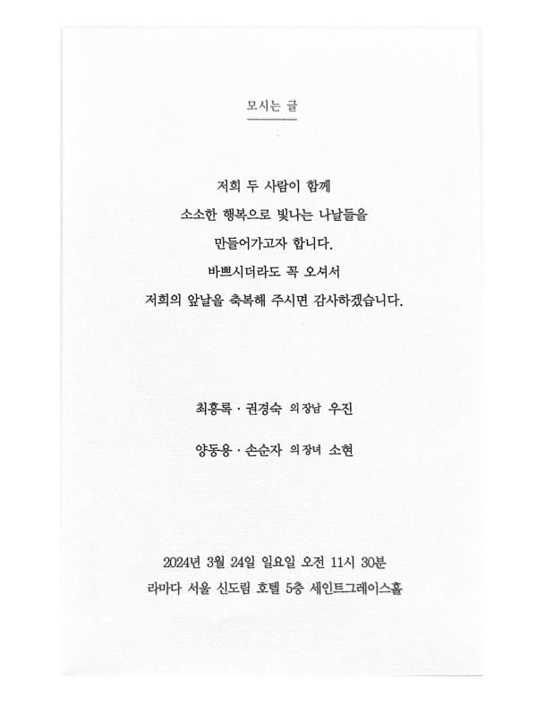 대한태권도협회 최우진 대리 결혼식을 아래와 같이 알립니다. 일시 : 2024년 3월 24일, 일요일 오전 11시 30분 장소 : 라마다 서울 신도림 호텔 5층 세인트그레이스홀 청첩장 첨부 | |