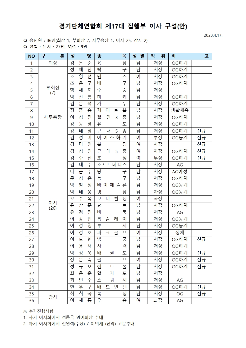 | 첨부파일 | 경기단체연합회 제17대 집행부 이사 구성(안20230417)001.jpg 경기단체연합회_보도자료_230417.hwp |