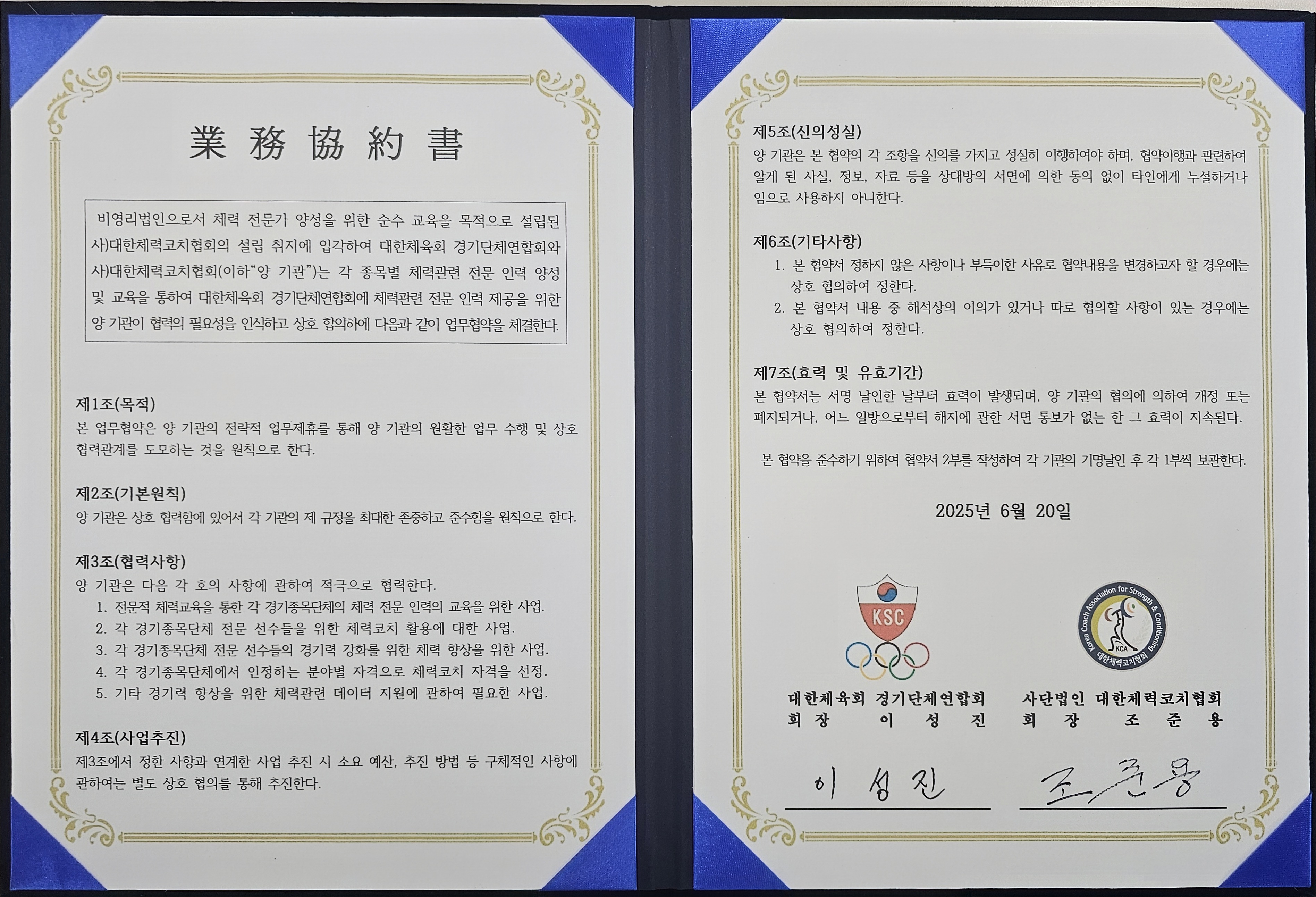 대한체육회경기단체연합회(회장 이성진)와 사단법인 대한체력코치협회(회장 조준용)는 2025년 6월 20일(목), 체육 전문 인재 양성과 종목단체의 체력지원 체계 강화를 위한 업무협약(MOU)을 체결하였다. 이번 협약을 통해 양 기관은 ▲종목단체 대상 체력 전문 인력 교육 ▲체력 향상 프로그램 개발 ▲현장 중심 체력 코칭 지원 ▲체력 데이터 제공 및 활용 등 다양한 분야에서 협력할 예정이다. 양 기관은 상호 협력을 바탕으로 체육 현장의 전문성과 실무 역량을 높이고, 지속적인 교류와 공동 사업을 추진해 나갈 계획이다.