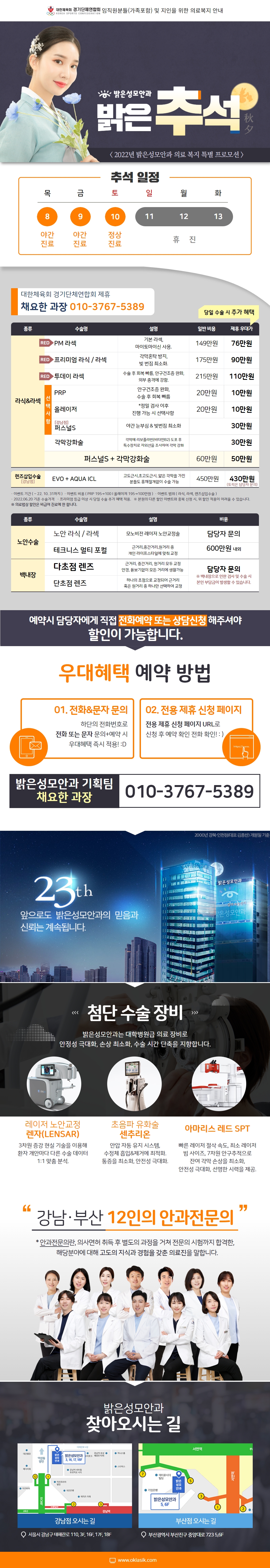 □ 대한체육회 경기단체연합회 임직원 및 가족 □ 병원 개요 - 밝은성모안과(서울점,부산점) 강남점 :서울시 강남구 테헤란로 110 캠브리지빌딩 3,16,17,18층(강남역 1번출구) 부산점 :부산시 부산진구 중앙대로 723 5,6층 (서면역 5번출구)